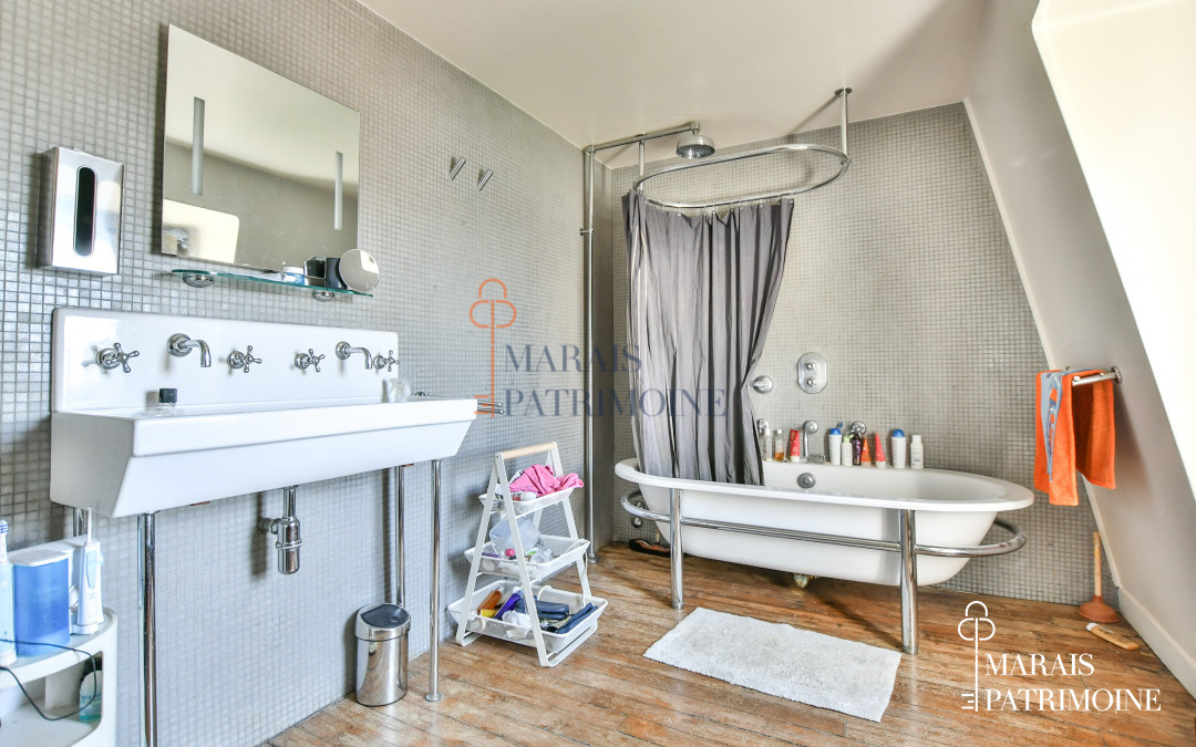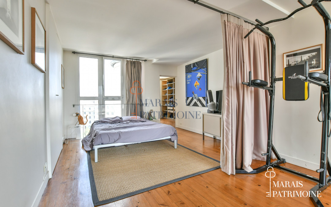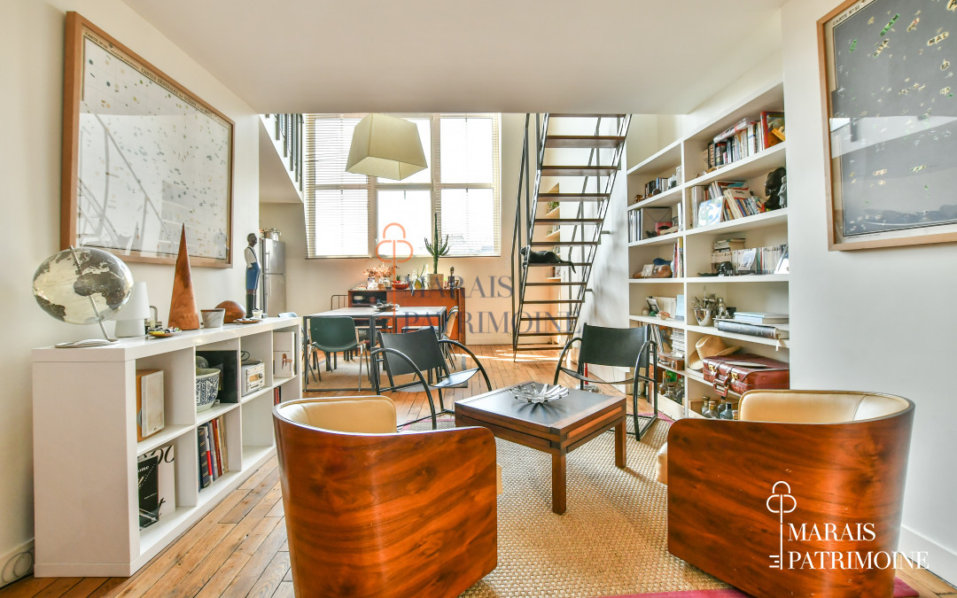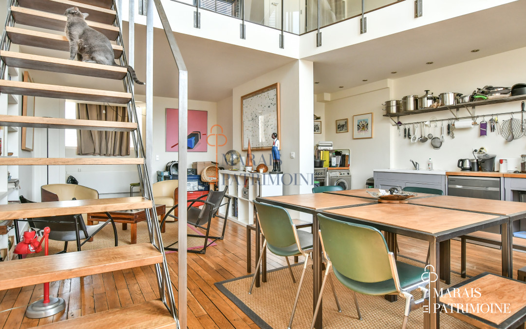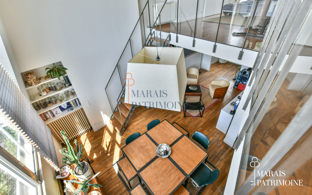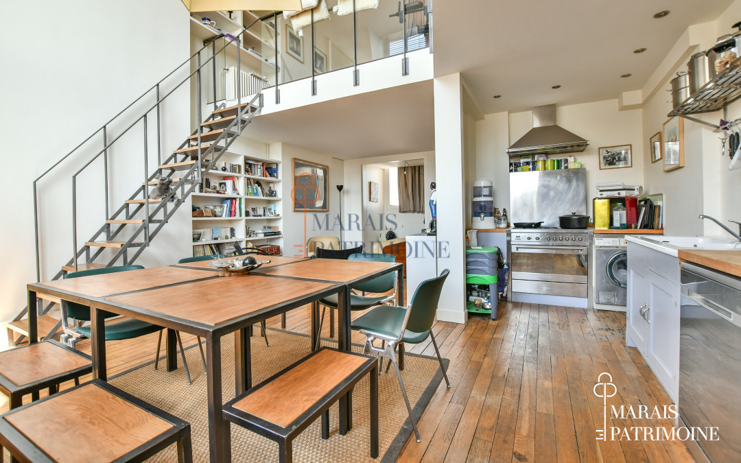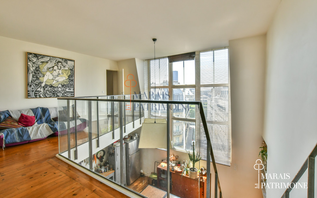 LOFT D'EXCEPTION - Paris III. A proximité du Carreau du Temple, une vue panoramique sur les toits de Paris, ce duplex de 96 m2 niché au 6e et 7e étage se compose d'un espace de vie, une cuisine US, un WC séparé, un coin nuit (transformable en chambre), une chambre et une vaste salle de bain, le tout sur 2 niveaux. Les volumes (5,30m de hauteur), le calme et l'éclairage naturel font de cet appartement un bien rare et atypique. Disponible immédiatement.